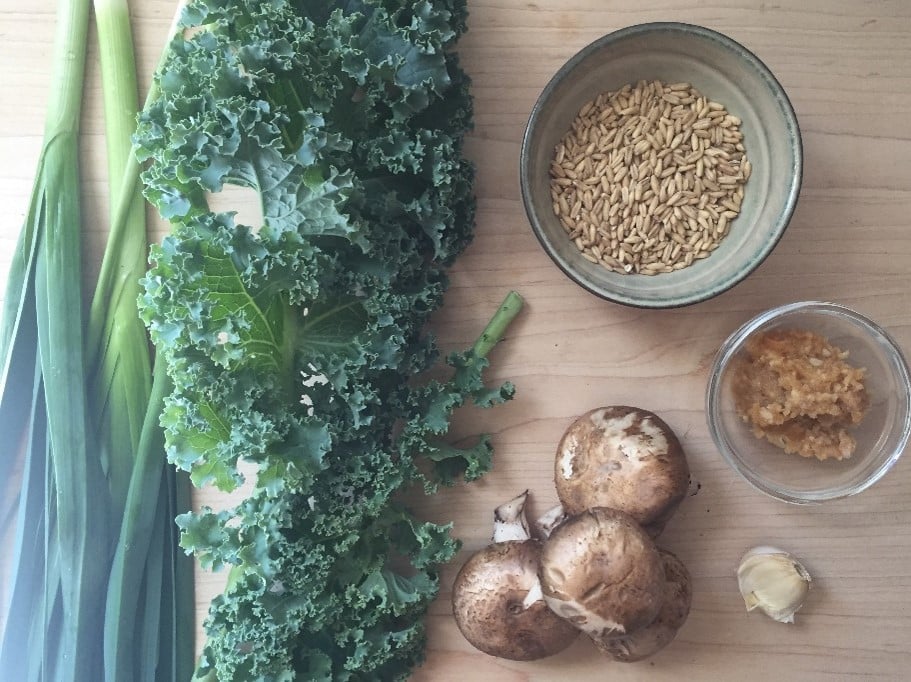 2. Sauté leeks in oil in medium pot over medium heat until soft. Add garlic, sauté for ~30 seconds. Add mushrooms, sauté for ~1 minute. Add kale and broth. Bring to a boil, reduce heat and simmer for ~5 minutes. Add cooked groats. Remove from heat.