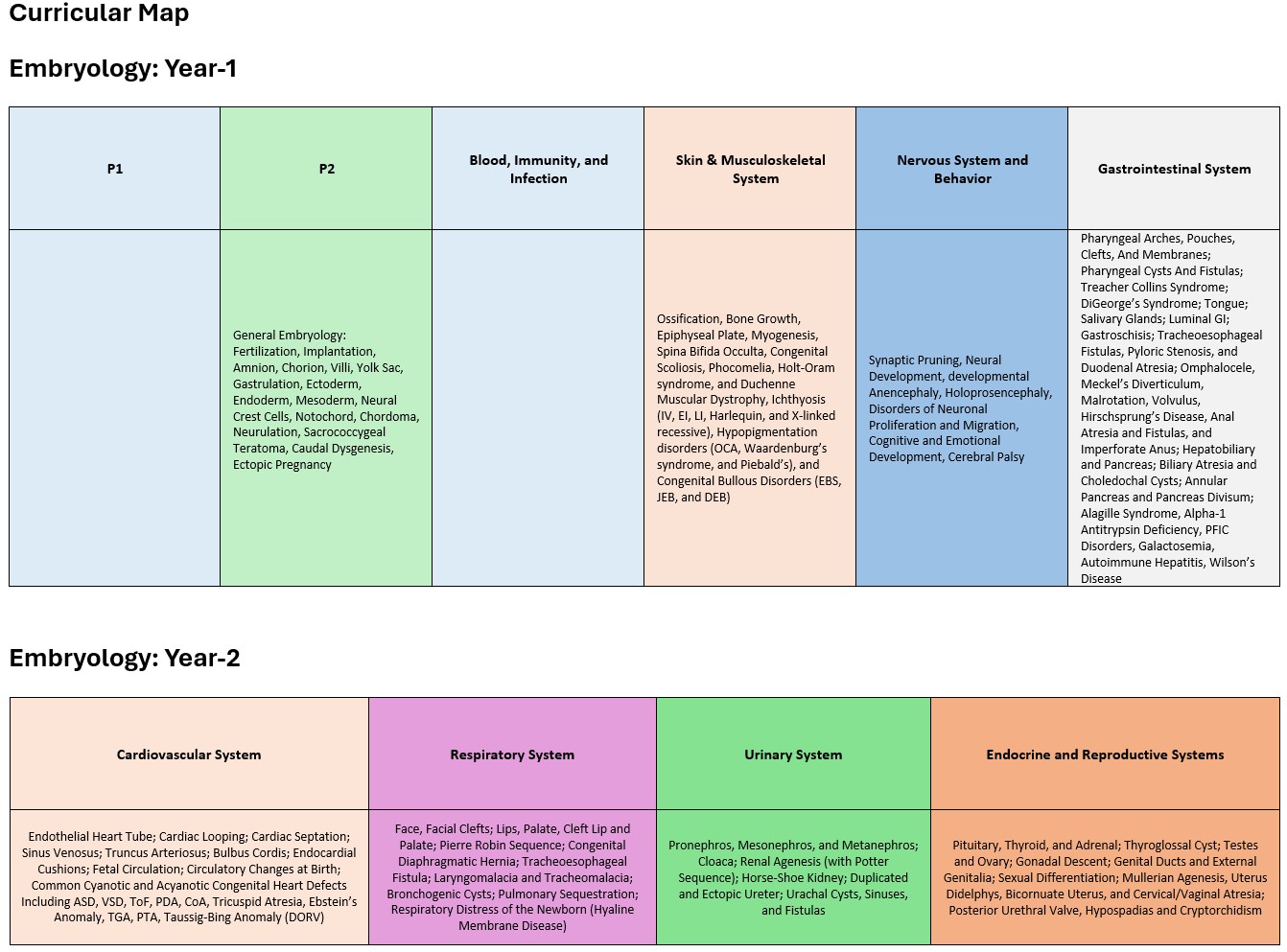 To maintain transparency and ensure continuous quality improvement, we utilize a curricular map that details the distribution and depth of embryology content across the Vista curriculum. Additionally, a course-level report is generated to evaluate the effectiveness of content delivery, integration, and assessment. These tools help ensure that our embryology curriculum remains cohesive, clinically relevant, and responsive to both learner needs and evolving educational standards.