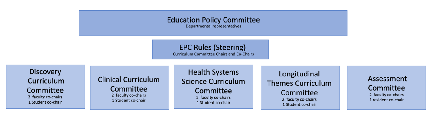 There are key changes to the curriculum oversight structure in Vista which will continue to function under the Education Policy Committee but will now include 5 curriculum EPC subcommittees that are either phase or pillar-based committees. Please listen to our podcast on the topic for details. These committees will have faculty (2) and trainee (1) triadic leadership. Membership expectations are enhanced in Vista with required attendance and expectations for all members that are accounted for in the block and rotation leadership hour calculations. Leadership terms are 3 years with the opportunity for reappointment by the dean. These leadership roles are each supported at 0.075 FTE per co-chair. Co-Chairs can work with EPC leadership and inform OEA to reallocated FTE based on individual responsibilities if the co-chair work is not evenly divided. Clinical Curriculum Committee Leadership is not included in this first call.