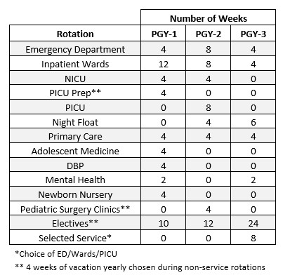 Our program uses a night float system on all inpatient rotations except for the ED, which is shift work. Interns participate in a night float call system for the wards and NICU, which entails one week of night call out of four weeks. Seniors have two weeks of night coverage at a time on the wards or PICU.