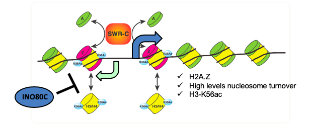 Transcriptionally active chromatin regions are characterized by the dynamic disruption and re-assembly of promoter proximal nucleosomes. Such chromatin dynamics are promoted by a combination of ATP-dependent chromatin remodeling enzymes (e.g. SWR1C, SWI/SNF, and INO80C), histone modifications (e.g. H3-K56Ac), and histone variants (e.g. H2A.Z). Our research uses a powerful combination of state-of-the-art chromatin biochemistry and genomic approaches in budding yeast to study the biological mechanisms that regulate both chromatin dynamics and transcriptional states. For more details (and some awesome animated movies) click the Research tab.