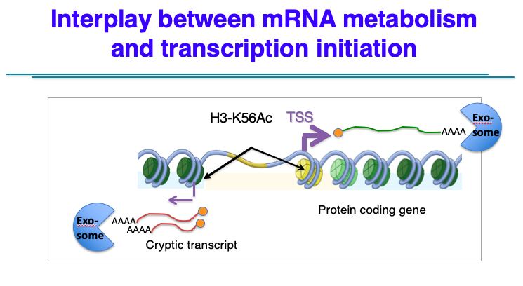 Our in vivo studies are currently focused on two areas that impinge on the concept of general transcriptional homeostasis. First, we are investigating a phenomenon whereby global stabilization of mRNAs (due to inactivation of the mRNA degradation machinery) leads to down-regulation of transcription initiation. For instance, rapid removal of the nuclear RNA exosome both stabilizes many RNAs (mRNAs and ncRNAs) but this also leads to a global decrease in transcription initiation, as assayed by Nascent Transcript Sequencing (Net-seq). Currently, we are investigating a model whereby mRNA stabilization leads to over-expression of selected chromatin regulators that impinge on nucleosome dynamics at promoter regions.