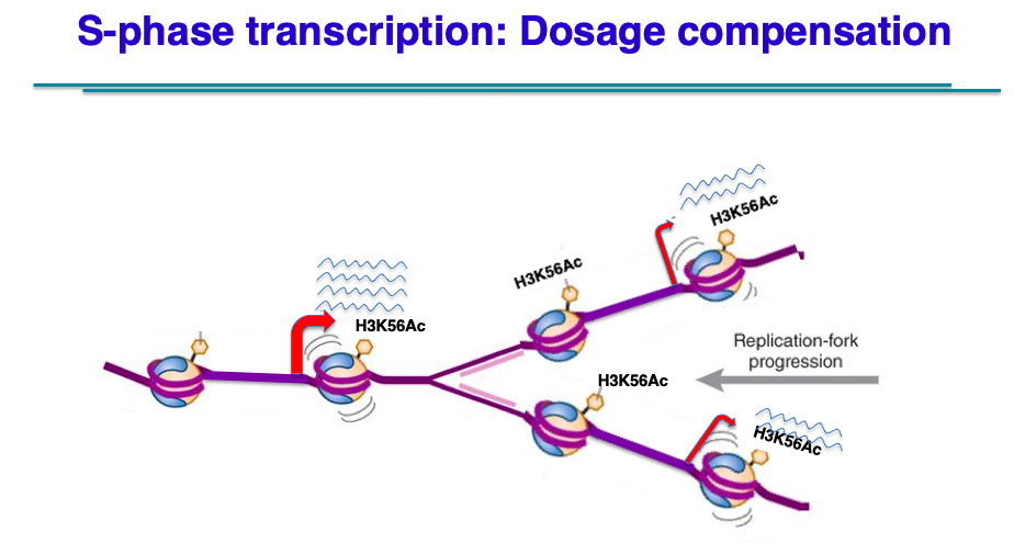 In the second in vivo project, we are investigating a conserved process whereby eukaryotic cells regulate the expression of newly replicated genes so as to control gene expression with cell size. In both yeast and mammalian cells, the duplication of genes during S phase does not lead immediately to a 2x increase in transcription. Rather, gene copies on each sister chromatid are only expressed at 50% levels, leading to an overall G1-level of transcription. This buffering process apparently functions to ensure that gene products (e.g. proteins) are expressed at levels appropriate for cell size. Indeed, as cells enter G2 and cells double their volume, gene transcription shows a global 2x increase in transcription in a step-wise fashion. Essentially, this is a form of gene dosage compensation that is cell cycle regulated. What regulates S phase dosage compensation is unclear, but we are currently entertaining models involving the replication-dependent assembly of cohesion or condensin complexes that might repress transcription in a dosage dependent fashion.