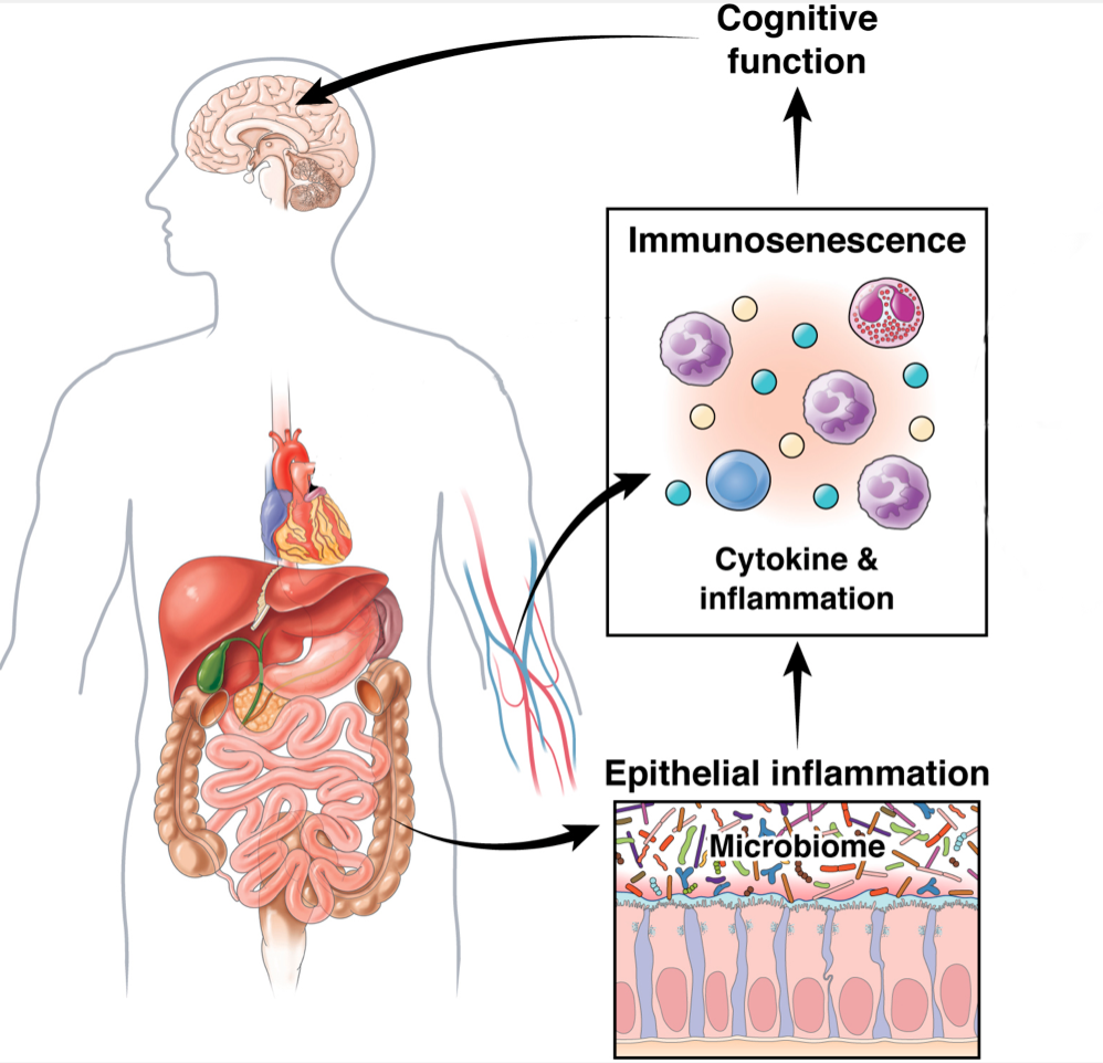 The concept of the “microbiota-gut-brain axis”, which originated from behavioral studies in microbiome-reconstituted mice, has advanced to current research that supports the microbiome may be responsible for some of the most devastating neurodegenerative disorders, including Alzheimer’s Disease (AD). This is underscored by the fact that AD pathogenesis has been linked to chronic bacterial infections as a possible etiology. Recent studies performed by members of the PMD have interrogated this connection among the intestinal microbiome and identified significant changes in the abundance of certain taxa in AD patients. Moreover, increased proportions of pro- and reduced proportions of anti-inflammatory bacteria in the intestine are associated with systemic inflammatory states in patients with cognitive impairment and brain amyloidosis. Thus, one current theory is that AD pathogenesis is closely related to the imbalance of the gut microbiome and may originate in the gut. Our goal is to transition our microbiome association studies with AD more towards causality by investigating how the AD microbiome dysbiosis observed correlates with inflammation and immunosenescence in different elder groups and ultimately to cognitive decline.