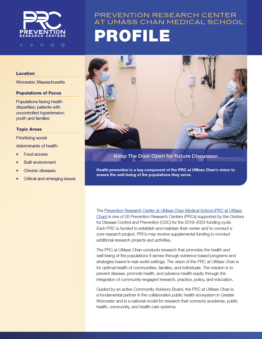This profile is credited to the Centers for Disease Control and Prevention: Prevention Research Center at UMass Chan Medical School CDC Profile