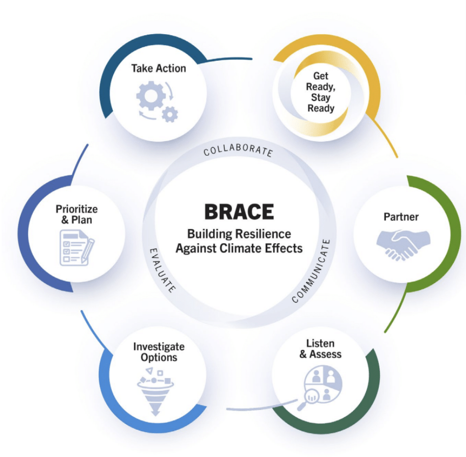 The Building Resilience Against Climate Effects (BRACE) framework is comprised of six key elements that guide public health officials and community partners through a collaborative process to improve health and wellbeing through climate action.