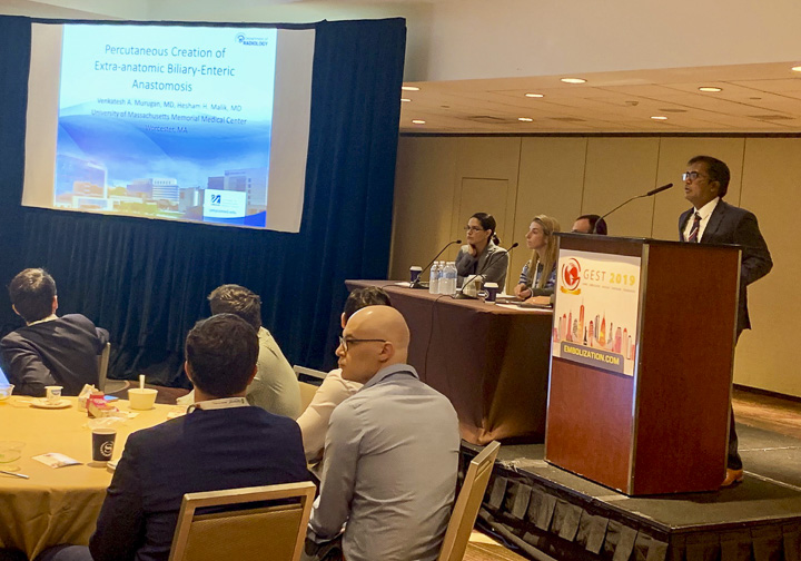 Three UMMS Radiology Residents, Daniel Alvarez Valero, MD, Roberto Kutcher-Diaz, MD, and Venkatesh Murugan, MBBS recently presented cases in a competition at GEST (Global Embolization Oncology Symposium Technologies) meeting in New York, NY. The GEST Trainee case competition is open to all medical students, residents, and fellows. The cases will be posted online to the GEST website/social media with the top 15 cases were presented live at the annual meeting in New York City on May 9-12, 2019. Awards were given to the top three cases presented at the meeting with the winner presenting their case during the Sunday afternoon Plenary session. Dr. Kutcher-Diaz's talk titled Embolization of Traumatic Abdominal Aortic Psuedoaneurysms won one of the awards.