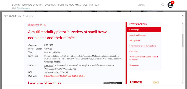 A multimodality pictorial review of small bowel neoplasms and their mimics. Educational poster and oral presentation virtually in Voice of EPOS (Electronic presentation online system); S. H. Hanfi, A. Goldstein, L. McIntosh, M. Yang, Y. H. Kim.