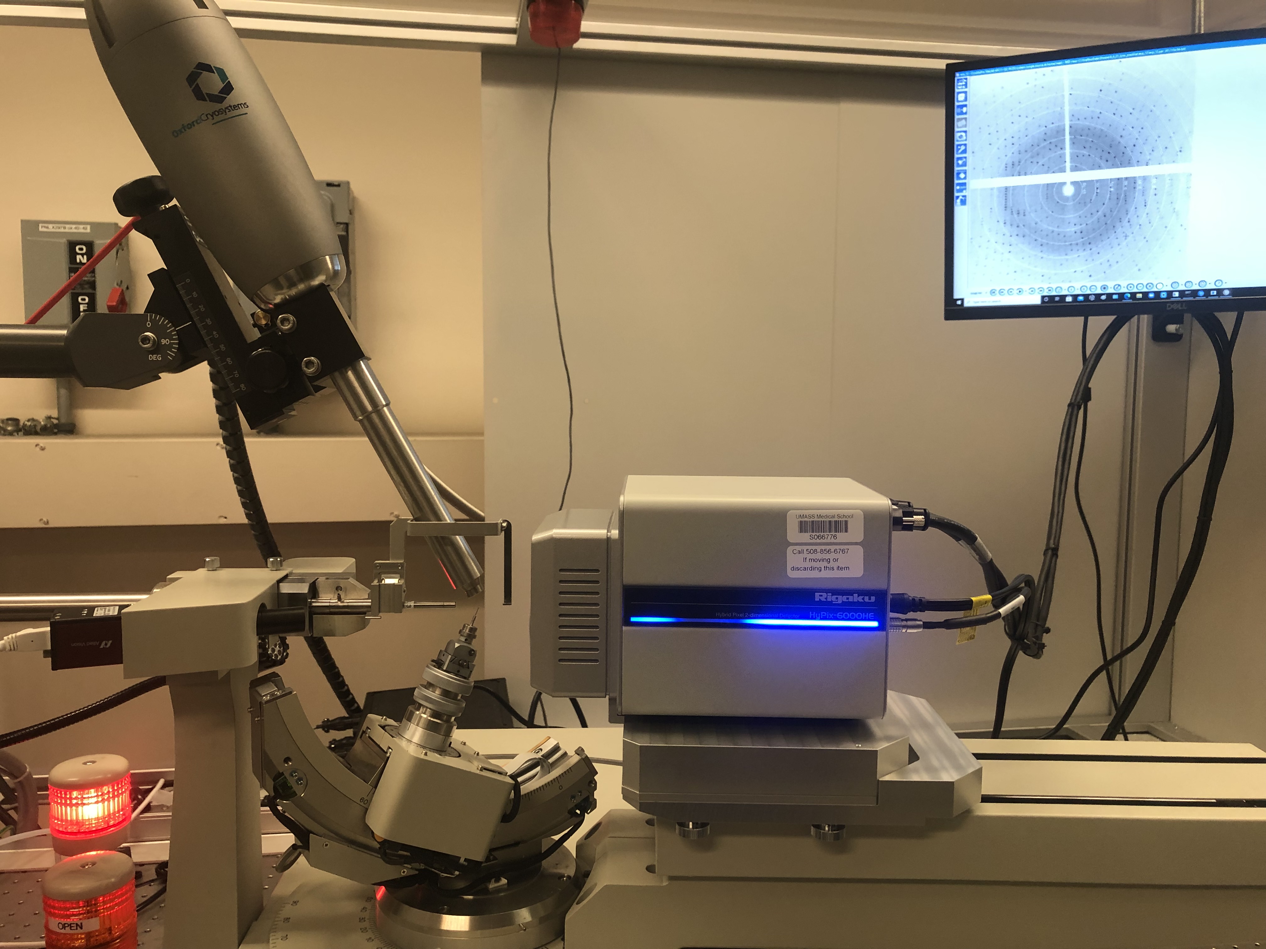 Facilities are housed on the 9th floor of the Lazare Research Building (LRB). The facility includes instrumentation purchased in 2012 from Rigaku using an NIH Shared Instrumentation Grant supplemented by UMass Chan funds (shown below) including a MicroMax-007 HF Microfocus rotating anode X-ray generator and Osmic optics. In 2019 we obtained a CS800 integrated auto-fill nitrogen gas cryostream system for more reliably maintaining protein crystals at cryogenic temperatures during X-ray data collection. In 2021, we upgraded the detector system with a new state-of-the-art HyPix-6000HE Hybrid Photon Counting (HPC) detector which permits more accurate and higher resolution diffraction data than our previous detector. With these upgrades, the core provides for very rapid, reliable and accurate diffraction data collection.