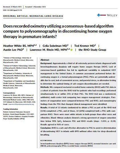 Rhein, Lawrence, et al. “Transmitted Home Oximetry and Duration of Home Oxy-gen in Premature Infants.” American Academy of Pediatrics, American Academy of Pediatrics, 1 Aug. 2020, pediatrics.aappublications.org/content/146/2/e20200079.