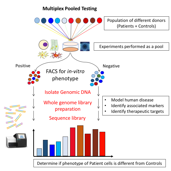 Our lab's research primarily revolves around the use of high-throughput in-vitro modeling of human cell lines for studying human genetic diseases, especially complex diseases. Our goal is to be able to perform multiple in-vitro phenotypic assays on a population of different donor cells to determine if the in-vitro penotype corresponds to the human phenotype. Showing this would be evidence that that the in-vitro model accurately models the human phenotype and further follow up studies using the model would be relevant for studying the human phenotype. To acheive this, our lab currently employs a high-throughput approach where many different donor cells are pooled together for experimentation. The diagram above shows an example where many different patient and control cells are pooled together. The cells are then phenotyped and sorted into Case and Control pools. The genomic DNA from each pool is extracted, library preped and sent for next generation sequencing. Using the resulting sequencing reads, the initial whole-genome sequencing data for each donor individual and a computational algorithm, we can accurately deconvolute donor proportion for each donor within the pool and obtain a phenotypic read-out for each donor. Then, we test whether the patient cells have significantly different phenotype from the control cells (blue versus red). Our current phenotypes include HSV-1 infectivity for predicting Alzheimer's disease as well as Cisplatin induced cell death in otic progenitor cells for predicting Hearing Loss from Cisplatin. The lab is open to exploring more phenotypes and is actively seeking funding and personnel to do so.