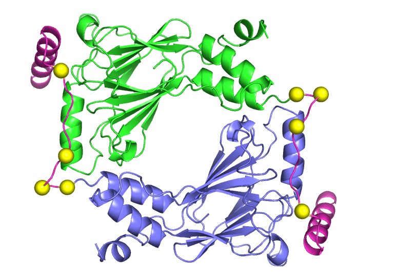 IRF family members play important roles in innate immunity, inflammation and apoptosis. Their clinical importance is evidenced by a strong link between IRF-5 and autoimmune diseases, particularly lupus. Our goal is to obtain a structural understanding of activation that will permit insight into approaches for inactivation that could inform development of future therapies in autoimmune disease. The first step in IRF activation is triggered by phosphorylation of Ser/Thr residues in a C-terminal autoinhibitory region. Phosphylation stimulates dimerization, translocation into the nucleus and assembly with the coactivator CBP/p300 and other proteins to stimulate transcription of type I interferons and other target genes. In collaboration with Dr. Celia Schiffer (BMB) and Dr. Kate Fitzgerald (Medicine), we are continuing work on the structural basis for activation of IRFs that was pioneered by our extraordinary colleague, Dr. Kai Lin, prior his tragic death. Our crystal structure of dimeric pseudophosphorylated IRF-5 (see figure), in comparison with structures of monomeric IRF-3 determined by Dr. Lin, has revealed how phosphorylation triggers a striking conformational rearrangement of the C-terminal region converting it from an autoinhibitory to a dimerization role. Inhibitors of this IRF5 activation have potential as lead compounds in autoimmune disease.