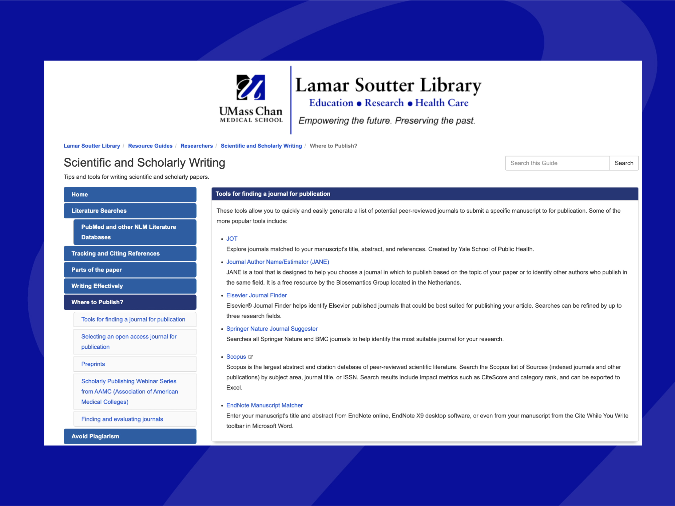 The Lamar Soutter Library has compiled a list of free tools and resources—including JOT, JANE, and tools from Elsevier and Springer—to help you find a suitable journal for publication.