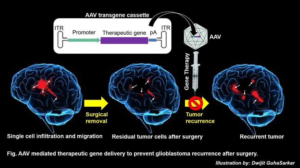 We believe that gene therapy has the potential to prevent this recurrence of tumor and thereby can improve the survival of patients. AAV vectors have currently emerged to be one of the safest and most attractive gene delivery vehicles for the treatment of CNS disorders. We have come up with a new paradigm of AAV mediated gene therapy approach to treat GBM tumors. We have demonstrated that by delivering genes of secretory therapeutic proteins to healthy brain cells we can create a microenvironment in the brain that is non-permissive to tumor growth (Maguire et al., 2008). The advantage of using secretory therapeutic molecule is that a relatively small number of transduced cells can function as the therapeutic protein factories and the secreted protein molecules can therapeutically impact a larger number of neighboring tumor cells (bystander effect). Using both xenograft and syngeneic mouse models we have shown that local intracranial delivery of AAVs encoding the therapeutic gene can effectively treat established aggressive human and mouse glioblastoma. We have also shown that combination of this AAV gene therapy approach with standard chemotherapeutic drug TMZ prolongs the survival of animals significantly over any single mode of treatment. Using AAV9 vectors, that can transduce the brain cells efficiently upon systemic delivery, we have further demonstrated that intravenous injection of AAVs carrying therapeutic gene can completely eliminate orthotopically established highly invasive human GBM from a xenograft mouse model. Moreover, we have shown that systemic delivery is a superior route of gene delivery over local injection for treatment of distant multifocal invasive tumors (GuhaSarkar et al., 2016).