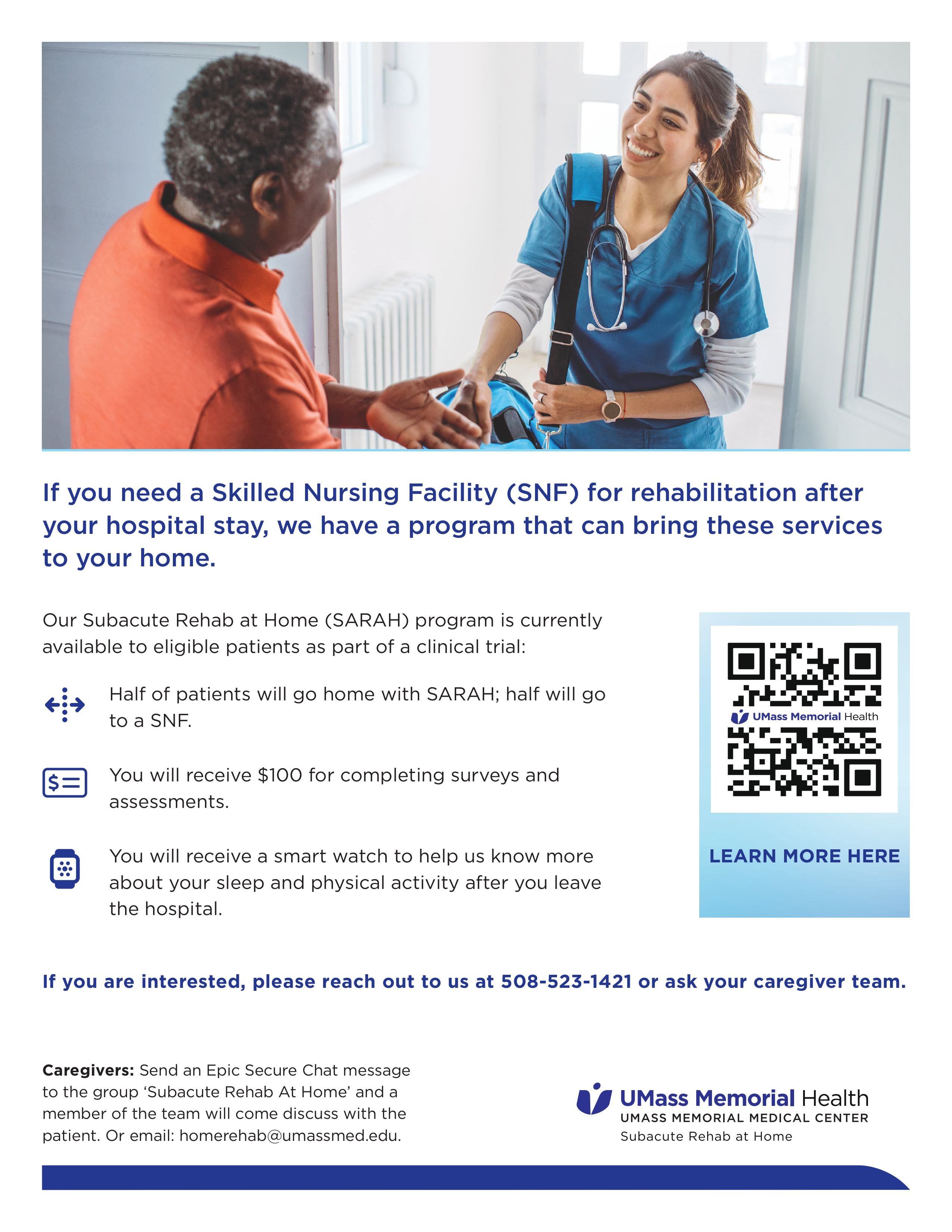 Are you a provider and are looking to refer a patient to us or just have general questions about our study? Reach out to us! Secure chat the group Subacute Rehab At Home!