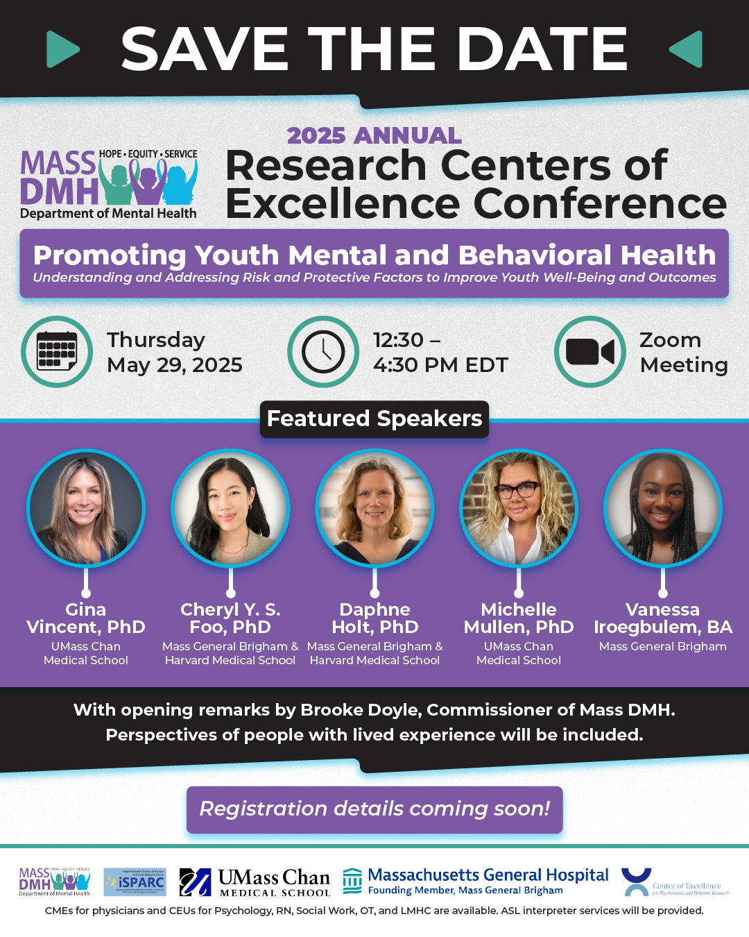 The 2025 Annual Massachusetts Department of Mental Health Research Centers of Excellence Conference took place on May 29, 2025. This year's theme is "Promoting Youth Mental and Behavioral Health: Understanding and Addressing Risk and Protective Factors to Improve Youth Well-Being and Outcomes". ASL interpreter services will be provided.