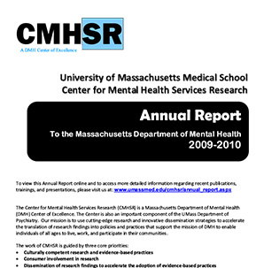 We are grateful to the Massachusetts Department of Mental Health for its continued support of the UMMS DMH Research Center of Excellence. Fiscal Year 2010 was the most successful year for external funding since the inception of the Center for Mental Health Services Research (CMHSR). Highlights include: