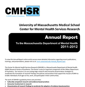 We are grateful to the Massachusetts Department of Mental Health for its continued support of the University of Massachusetts Medical School (UMMS) DMH Research Center of Excellence, the Center for Mental Health Services Research (CMHSR). We continue to leverage the DMH investment into innovative, recovery-oriented, state-of-the-art psychosocial and systems research that informs and advises individuals with lived experience and their families, providers, administrators and policy-makers navigating the behavioral health landscape in the Commonwealth and beyond. Highlights of Fiscal Year 2012 include an increase in the number of research grants and contracts awarded and launching new initiatives including a strategic planning process to guide our growth and trajectory over the coming years. DMH and UMMS Psychiatry leadership partnered with CMHSR faculty to sharpen our focus on research priorities that support the DMH mission to provide the best possible patient-centered, recovery-oriented care to those it serves.