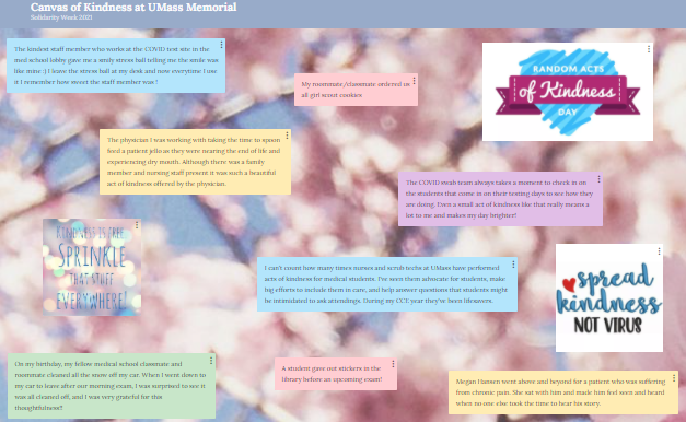 Share small acts of kindness, such as a smile, and make UMass a center of warmth and joy! Recall a random act of kindness you witnessed from students, patients, faculty, staff, or visitors! Submit your recollections via the link above, and your answers will be compiled into a virtual “canvas of kindness” to be shared with the entire UMass community here and on our Instagram page!