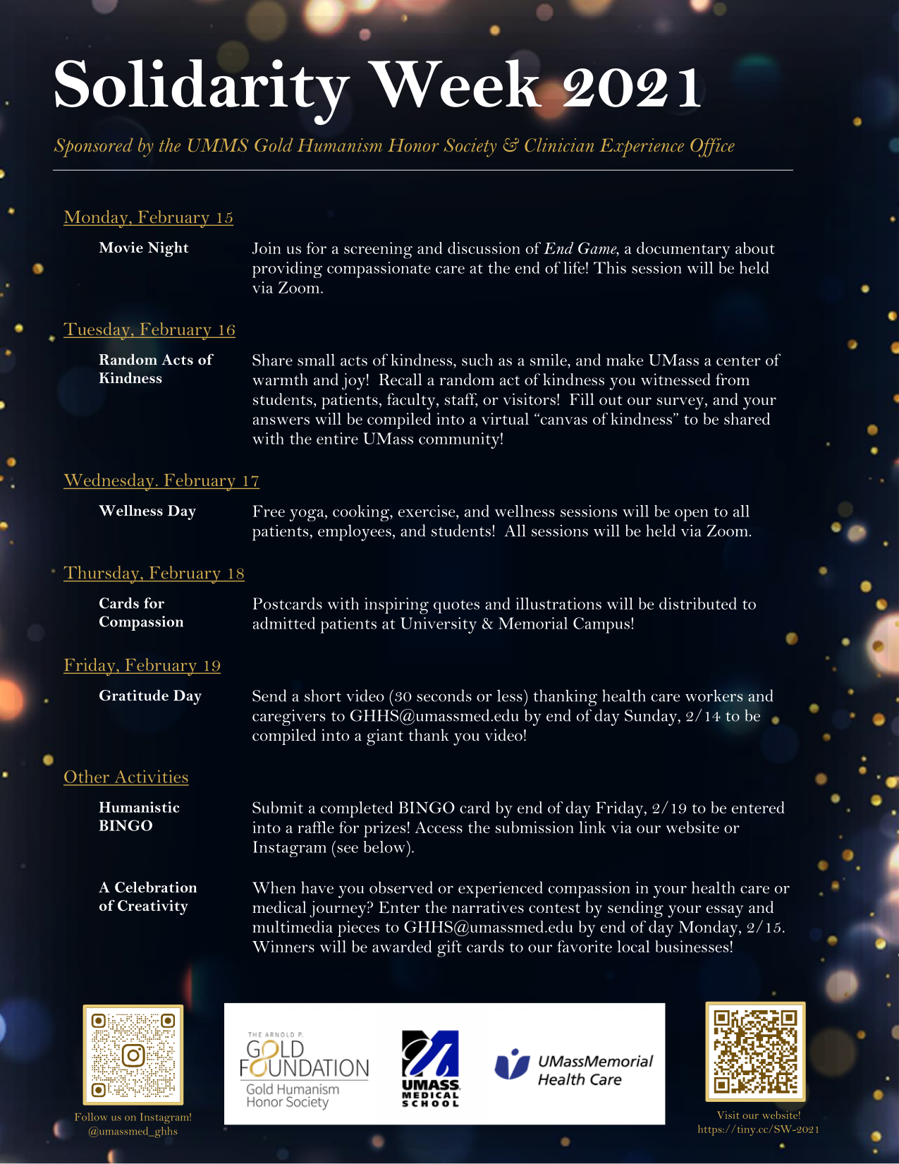 Sponsored by the UMass Chan Gold Humanism Honor Society and the Clinician Experience Office, Solidarity Week is a national celebration of compassionate and patient-centered care. This year, Solidarity Week will be held February 15-19.