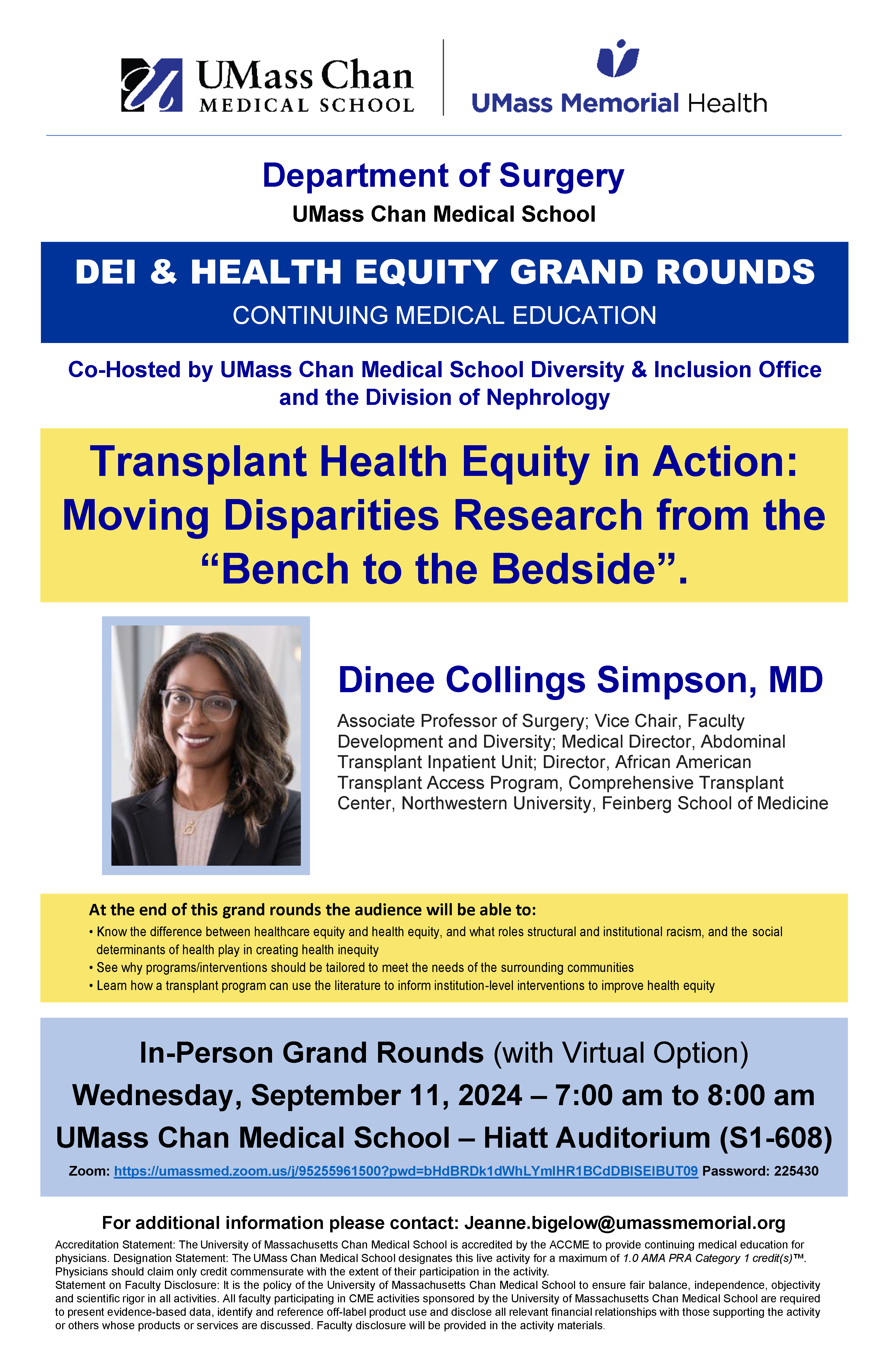 On September 11, 2024 the Department of Surgery DEI Task Force hosted Dinee Simpson, MD in a Grand Rounds event that included a resident session led by Catherine Bixby, MD and a Q&A Luncheon with Marlina Duncan, MD Vice Chancellor for Diversity & Inclusion. Dr. Simpson's research focuses on health equity, including identifying and removing barriers to transplantation and developing interventions to promote diversity and inclusion in healthcare. Her leadership in this field has earned her recognition as a national voice advocating for patient-centered care and social justice in medicine.