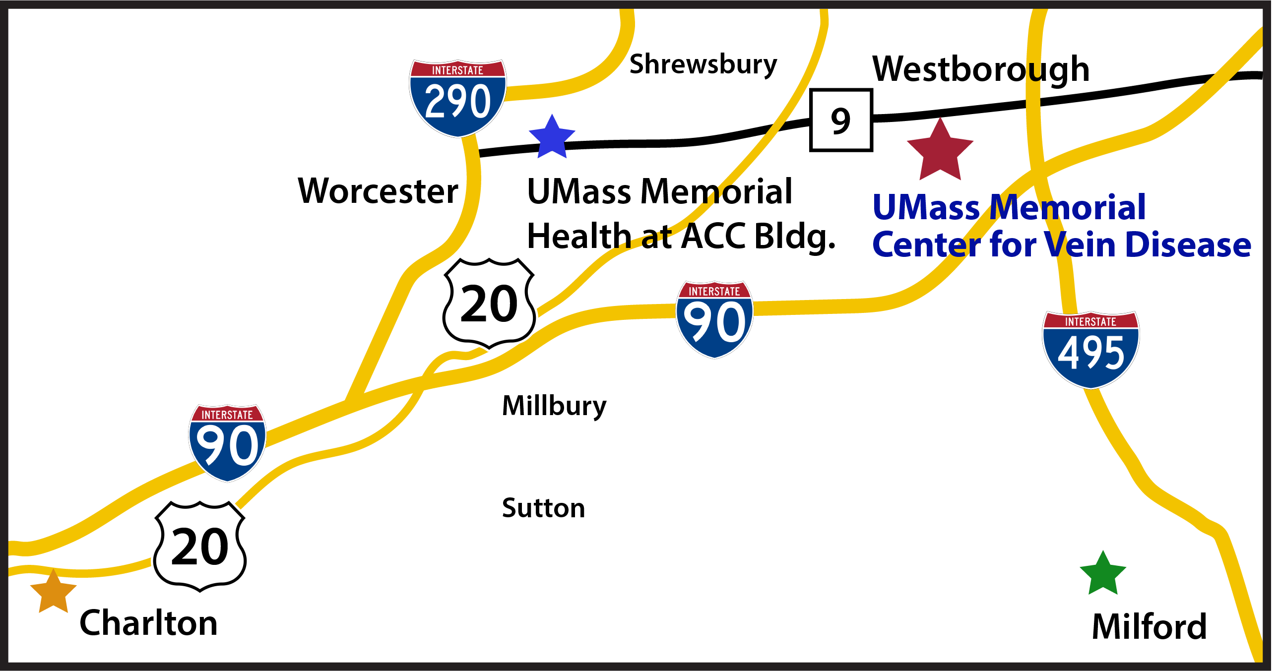 Our community location at the UMass Memorial Medical Group at Northborough Crossing offers a comprehensive range of treatment options for varicose veins and spider veins. Our location at University campus offers operative treatment, endovascular services, and care for more complex venous conditions.