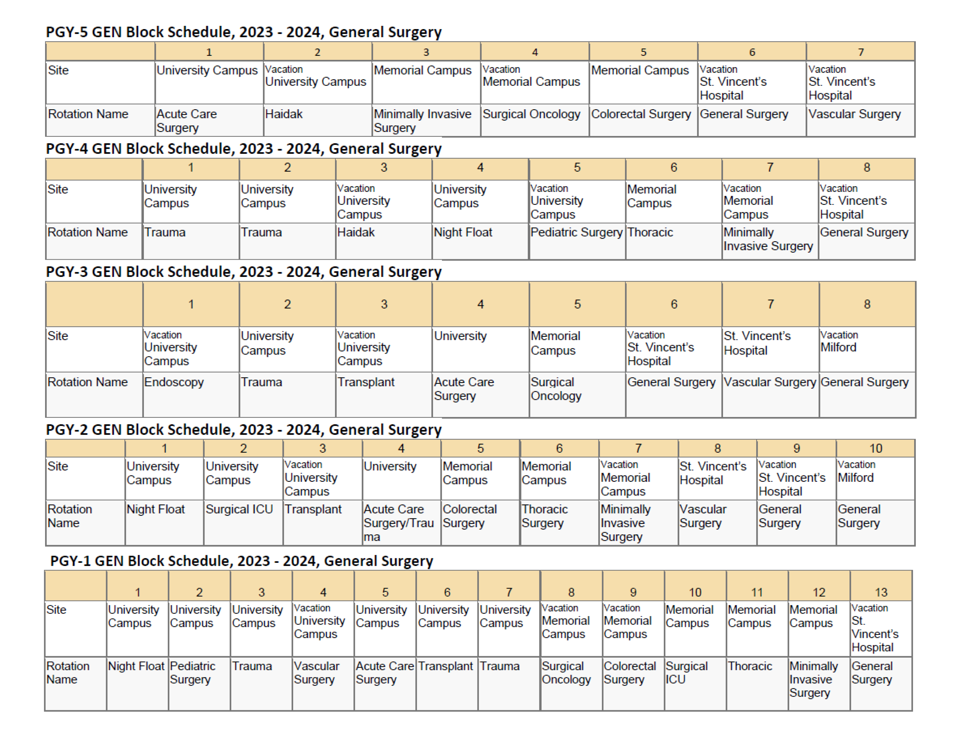 Printable sample rotations from PGY-1 to PGY-5 for the 2023-2024 academic year.