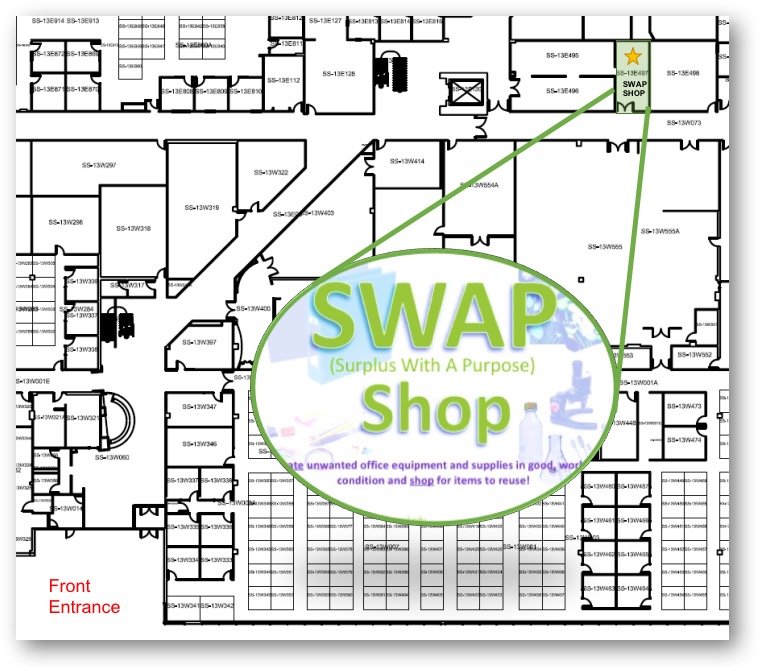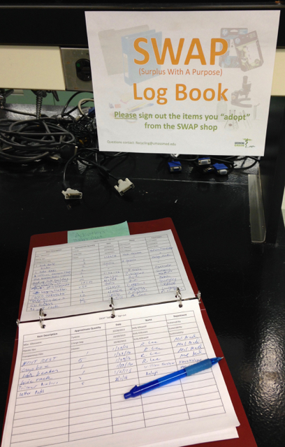 SWAP stands for Surplus With A Purpose and is a program designed to divert material from the campus waste stream. The concept of facilitating the reuse of materials on campus through SWAP evolved in 2015 from the virtual world of the school’s Intranet to a brick-and-mortar shop, now located in room S3-209 of the main Medical School building