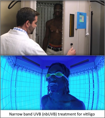 If the patient has too many spots for just topical treatments (usually more than 5% of their body surface covered), I strongly recommend they use narrow band UVB (nbUVB) phototherapy, which is offered at many dermatologists’ offices around the country. For those who have traveled to our clinic from a distance and therefore can’t get their treatment directly from us, we try to help them find a location that offers it closer to their home, and we’re often successful! This treatment requires 2-3 visits per week, each treatment takes only 1-4 minutes, and again it takes 2-3 months to start seeing the improvement. However the way that nbUVB treatment is given is very important – if not done correctly it may not work well, if at all. That’s why I prefer to treat patients myself in our booths, but if they live too far away, I give them a copy of our protocol for the therapy to give to their doctor in case he or she is willing to use it – it can be found here. Sometimes patients opt for purchasing a nbUVB unit for their home, and we help them do this. Many times insurance doesn’t cover it though, and they have to pay for it themselves. I also suggest patients use topicals on areas that are highly visible or otherwise important to them in addition to phototherapy.