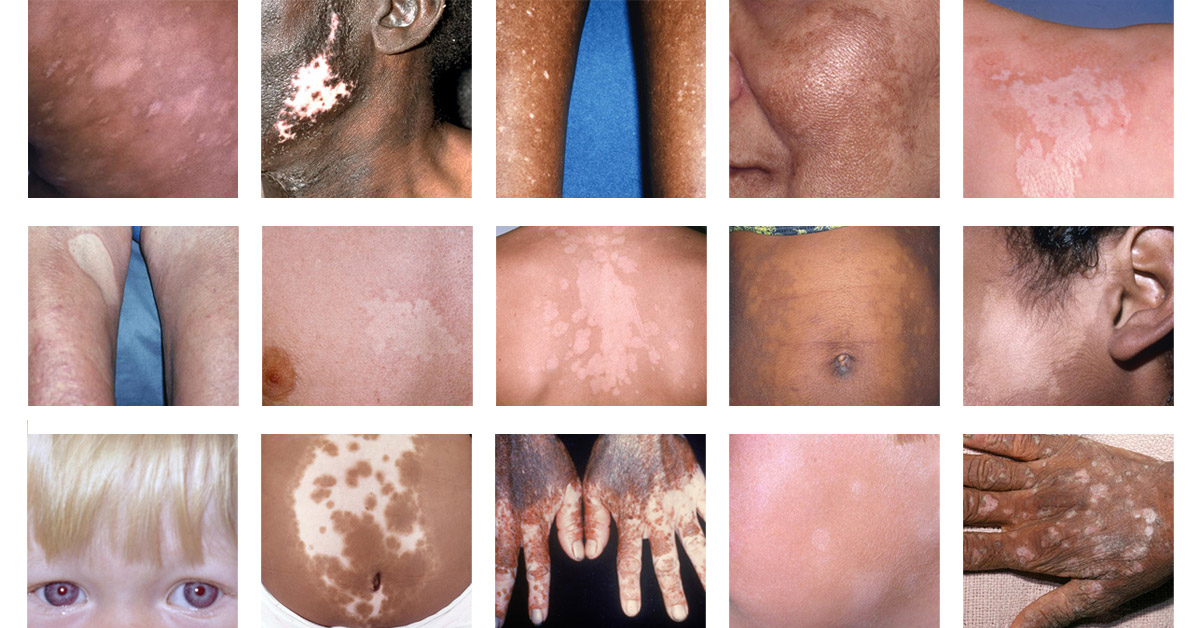 Finally, piebaldism causes depigmentation localized to just the front of the body (not the back), includes a “white forelock” or white hair at the front of the scalp, is present from birth, and usually runs in families. That’s about it for true white spots!